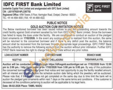 IDFC First Bank Ltd Gold Auctions Auction in Chennai