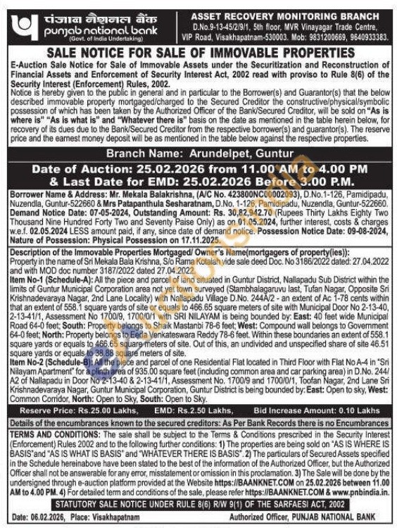Item No-1 (Schedule-A): All the piece and parcel of land situated in Guntur District, Nallapadu Sub District within the limits of Guntur Municipal Corporation area not yet town surveyed (Stambhalagaruvu last, Tufan Nagar, Opposite Sri Krishnadevaraya Nagar, 2nd Lane Locality) with Nallapadu Village D.No. 244A/2-an extent of Ac 1-78 cents within that an extent of 558.1 square yards of site or equals to 466.65 square meters of site with Municipal Door No 2-13-40, 2-13-41/1, Assessment No 1700/9, 1700/0/1 with SRI NILAYAM is being bounded by: East: 40 feet wide Municipal Road 64-0 feet: South: Property belongs to Shaik Mastanbi 78-6 feet, West: Compound wall belongs to Govemment 64-0 feet; North: Property belongs to Eeda Venkateswara Reddy 78-6 feet. Within these boundaries an extent of 558.1 square yards or equals to 466.65 square meters of site. Out of this, an undivided and unspecified share of site 46.51 square yards or equals to 38.88 square meters of site. Item No-2 (Schedule-B): All the piece and parcel of one Residential Flat located in Third Floor with Flat No A-4 in "Sri Nilayam Apartment" for a plinth area of 935,00 square feet (including common area and car parking area) in D.No. 244/A2 of Nallapadu in Door No 2-13-40 & 2-13-41/1, Assessment No. 1700/9 and 1700/0/1, Toofan Nagar, 2nd Lane Sri Krishnadevaraya Nagar, Guntur Municipal Corporation, Guntur District is being bounded by: East: Open to sky, West: Common Corridor, North: Open to Sky, South: Open to Sky.