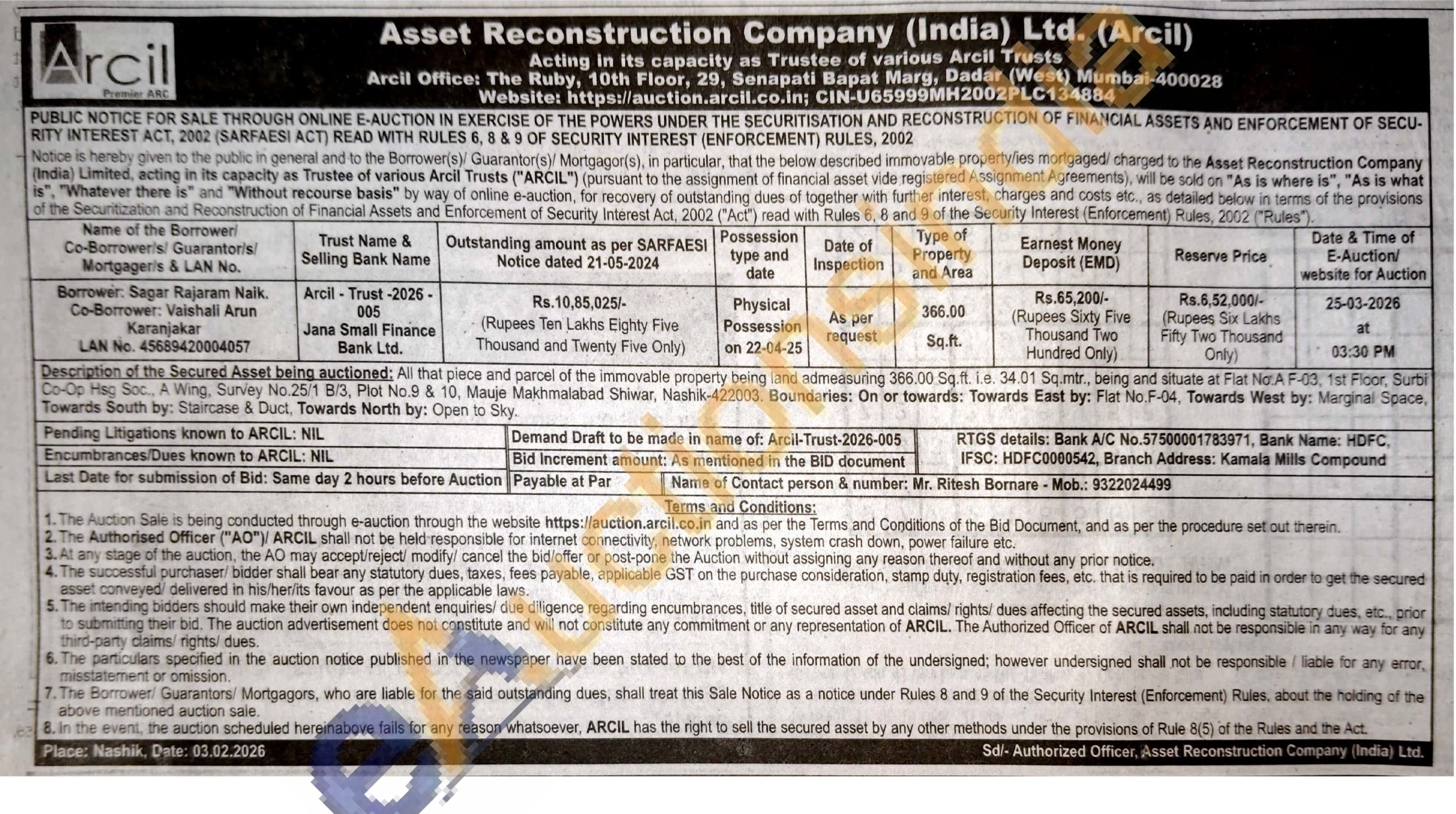 Description of the Secured Asset being auctioned; All that piece and parcel of the immovable property being land admeasuring 366.00 Sq.ft. i.e. 34.01 Sq.mtr., being and situate at Flat No.A F-03, 1st Floor, Surbi Op Hsg Soc., A Wing, Survey No.25/1 8/3, Plot No.9 & 10, Mauje Makhmalabad Shiwar, Nashik-422003. Boundaries: On or towards: Towards East by: Flat No.F-04, Towards West by: Marginal Space, Co-Towards South by: Staircase & Duct, Towards North by: Open to Sky