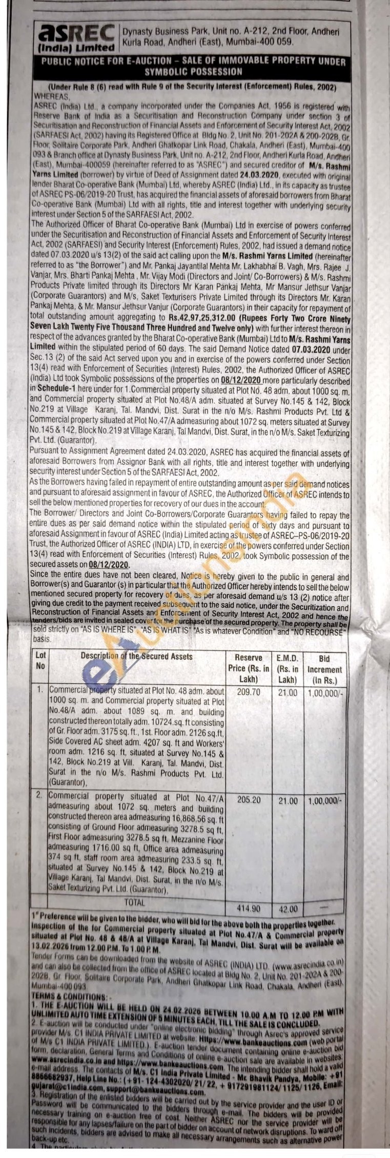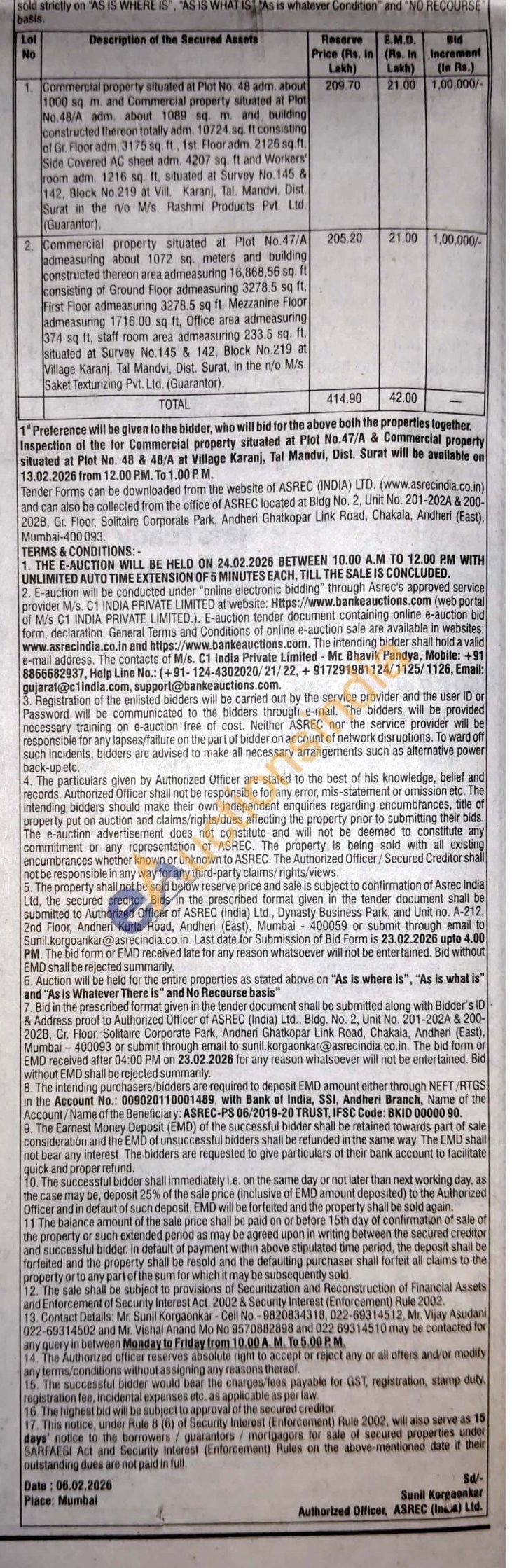 Commercial property situated at Plot No.47/A admeasuring about 1072 sq. meters and building constructed thereon area admeasuring 16,868.56 sq. ft consisting of Ground Floor admeasuring 3278.5 sq ft, First Floor admeasuring 3278.5 sq ft. Mezzanine Floor admeasuring 1716.00 sq ft, Office area admeasuring 374 sq ft, staff room area admeasuring 233.5 sq. ft. situated at Survey No.145 & 142, Block No.219 at Village Karanj, Tal Mandvi, Dist. Surat, in the n/o M/s. Saket Texturizing Pvt. Ltd. (Guarantor),