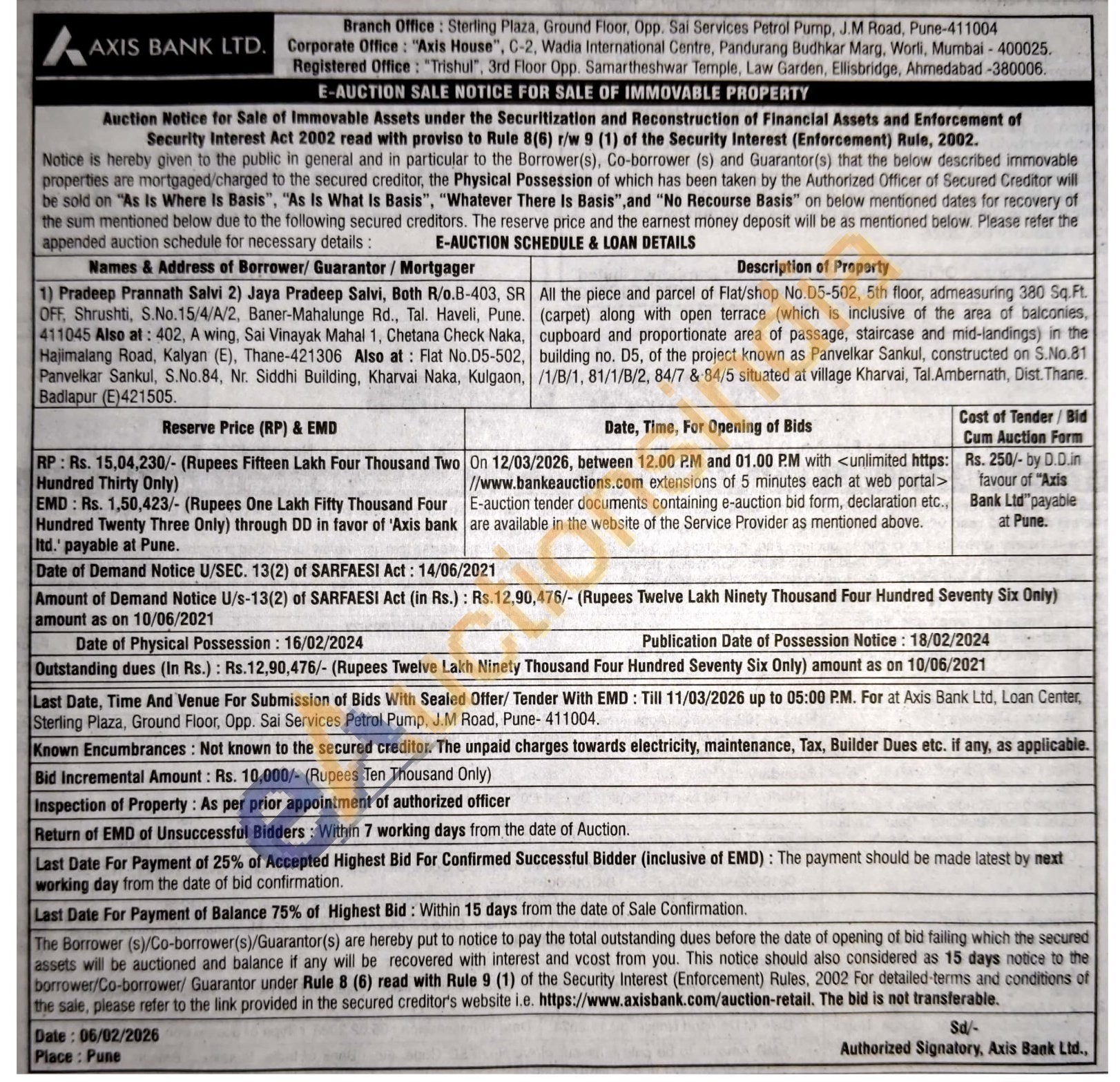 All the piece and parcel of Flat/shop No.D5-502, 5th floor, admeasuring 380 Sq.Ft. (carpet) along with open terrace (which is inclusive of the area of balconies, cupboard and proportionate area of passage, staircase and mid-landings) in the building no. D5, of the project known as Panvelkar Sankul, constructed on S.No.81 /1/B/1, 81/1/B/2, 84/7 & 84/5 situated at village Kharvai, Tal. Ambernath, Dist. Thane.