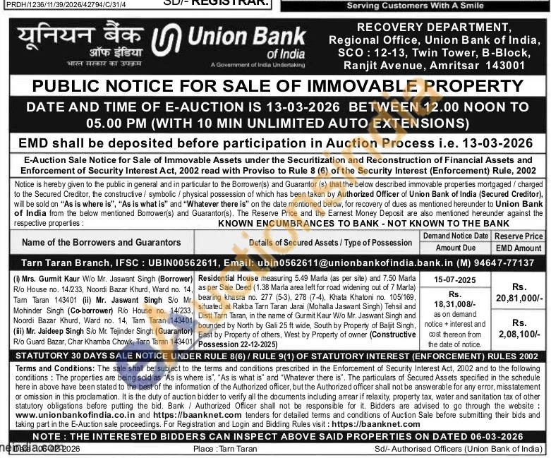 Residential House measuring 5.49 Marla (as per site) and 7.50 Marla as per Sale Deed (1.38 Marla area left for road widening out of 7 Marla) bearing khasra no. 277 (5-3), 278 (7-4), Khata Khatoni no. 105/169, situated at Rakba Tarn Taran Jarai (Mohalla Jaswant Singh) Tehsil and Distt Tarn Taran, in the name of Gurmit Kaur W/o Mr. Jaswant Singh and bounded by North by Gali 25 ft wide, South by Property of Baljit Singh, East by Property of others, West by Property of owner