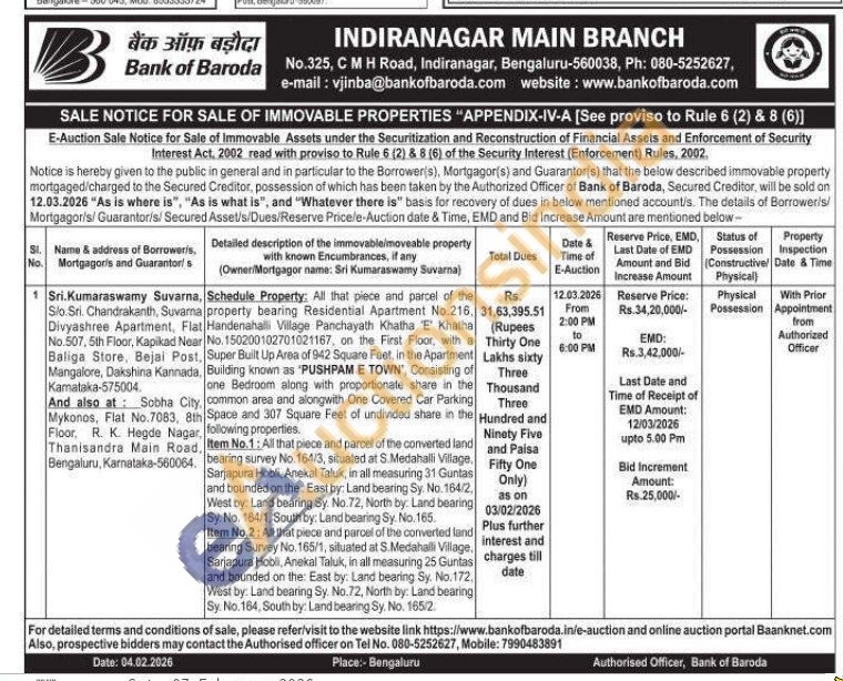 Schedule Property: All that piece and parcel of the property bearing Residential Apartment No.216, Handenahalli Village Panchayath Khatha 'E' Khatha No. 150200102701021167, on the First Floor, with a Super Built Up Area of 942 Square Feet, in the Apartment Building known as 'PUSHPAM E TOWN', Consisting of one Bedroom along with proportionate share in the common area and alongwith One Covered Car Parking Space and 307 Square Feet of undivided share in the following properties. Item No.1: All that piece and parcel of the converted land bearing survey No.164/3, situated at S. Medahalli Village. Sarjapura Hobli, Anekal Taluk, in all measuring 31 Guntas and bounded on the East by: Land bearing Sy. No. 164/2, West by: Land bearing Sy. No.72, North by: Land bearing Sy. No. 164/1, South by: Land bearing Sy. No. 165. Item No.2: All that piece and parcel of the converted land bearing Survey No. 165/1, situated at S.Medahalli Village, Sarjapura Hobili, Anekal Taluk, in all measuring 25 Guntas and bounded on the East by: Land bearing Sy. No. 172, West by: Land bearing Sy. No.72, North by: Land bearing Sy. No. 164, South by: Land bearing Sy. No. 165/2