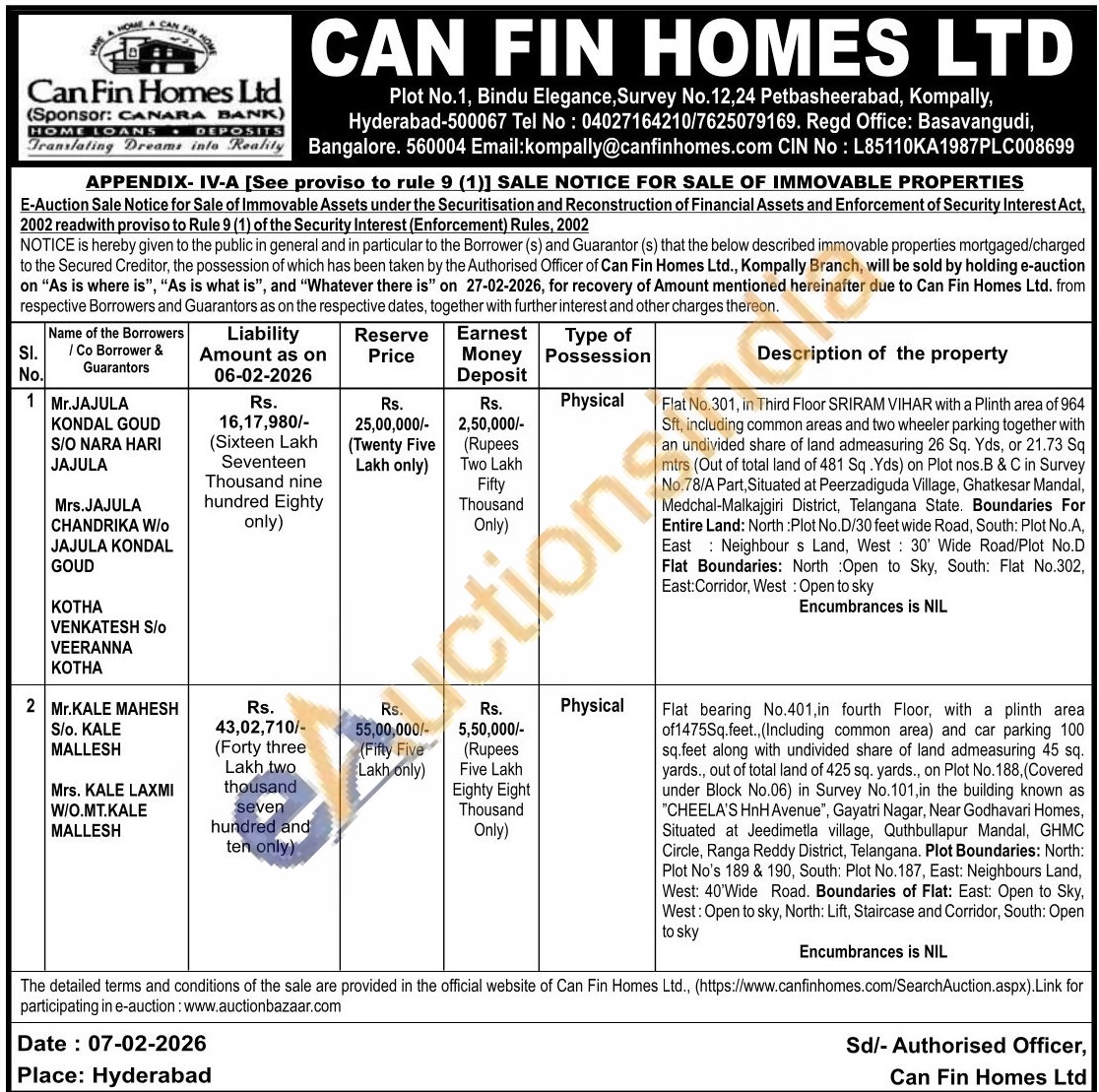Flat bearing No.401, in fourth Floor, with a plinth area of1475Sq.feet., (Including common area) and car parking 100 sq.feet along with undivided share of land admeasuring 45 sq. yards., out of total land of 425 sq. yards., on Plot No. 188, (Covered under Block No.06) in Survey No.101, in the building known as "CHEELA'S HnH Avenue", Gayatri Nagar, Near Godhavari Homes, Situated at Jeedimetla village, Quthbullapur Mandal, GHMC Circle, Ranga Reddy District, Telangana. Plot Boundaries: North: Plot No's 189 & 190, South: Plot No. 187, East: Neighbours Land, West: 40'Wide Road. Boundaries of Flat: East: Open to Sky, West: Open to sky, North: Lift, Staircase and Corridor, South: Open to sky