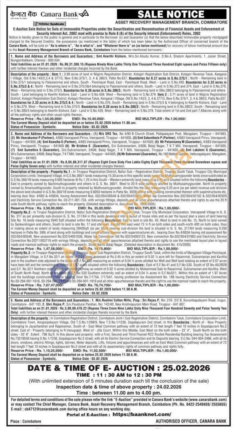 Description of the property: Item 1:3.98 acres of land in Nilgiris Registration District, Kotagiri Registration Sub District, Kotagiri Revenue Taluk, Kengarai I Village, Old S.No. 143/2,3,4 & 377/3, New S.No.375/1, 3, 4 & 380/3, Patta No.637. Boundaries for 0.27 acres in S.No.375/1: North Remaining land in S.No.375/1 belonging to Palaniammal and others, South-Panchayat Road, East Panchayat Road, West-Land in S.No.450. Boundaries for 3.33 acres in S.No.375/3 & 4: North Remaining land in S.No.375/3&4 belonging to Palaniammal and others, South-Land in S.No.373 and 374, East-Land in S.No.379. West Remaining land in S.No.375/3. Boundaries for 0.38 acres in S.No.380/3: North Remaining land in SNo.380/3 belonging to Palaniammal and others South-Land belonging to Keerthi Kishore, East Land in S.No. 439. West-Remaining land in S.No. 379. Item 2: 3.71 acres of land in Nilgiris Registration District, Kotagiri Registration Sub District, Kotagiri Revenue Taluk, Kengarai I Village, Old S.No. 143/2, 3, 4 & 377/3, New S.No.375/1, 3, 4 & 380/3, Patta No.637. Boundaries for 3.33 acres in S.No.375/3 & 4: North-Land in S.No.376, South-Remaining land in S.No.375/3 & 4 belonging to Keerthi Kishore, East-Land in S.No.379. West-Remaining land in S. No.375/3. Boundaries for 0.38 acres in S.No.380/3: North-Remaining land in S.No.380/2, South-Remaining land in S. No.380/3 belonging to Keerthi Kishore, East Land in S.No. 439, West-Remaining land in S.No.379. Total extent of 1st and 2nd part 7.69acres along with all the pathway rights and other usual rights thereon.