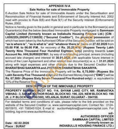 PROPERTY BEARING PLOT NO. 114, SHYAM LAKE CITY, NR. RAMVATIKA VIBHAG-3, SAYAN KATHOR ROAD, BLOCK NO. 196, 220, NEW BLOCK NO. 196 (K. J. P. BLOCK NO. 196/300), VELANJA, SURAT, GUJARAT-394150.