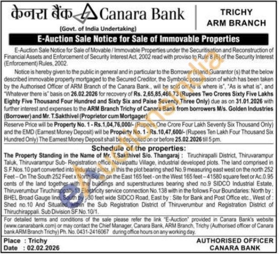 Schedule of the properties: The Property Standing in the Name of Mr. T.Sakthivel Sio. Thangaraj: Tiruchirapalli District, Thiruvarampur Taluk, Thiruvarampur Sub-Registration office Navalpattu Village, industrial developed plots. The land comprised in S.F.Nos. 10 part converted into industrial plots, in this the plot bearing shed No.9 measuring east west on the north 252 Feet-On The South 252 Feet x North South on the East 165 feet on the West 165 feet-41580 square feet or Ac.0.95 cents of the land together with the buildings and superstructures bearing shed no.9 SIDCO Industrial Estate, Thiruverumbur Tiruchirappalli-13 Electricity service connection No. 138 with in the follows Four Boundaries: North by BHEL Broad Gauge line, South by: 30 feet wide SIDCO Road, East by: Site for Bank and Post Office etc., West of Shed no.10 And Situated within the Sub Registration District of Thiruverumbur and Registration District of Thiruchirappali Sub Division SF No.10/1