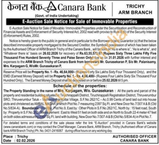 Schedule of the properties: The Property Standing in the name of Mrs. Karpagam, W/o. Gunasekaran: All the parts and parcel of the property and residential building situated in Tiruchirappalli District, Tiruchirappalli Registration District, Thiruverumbur SRO, Thiruverumbur Taluk-Vazhavanthankottai Village, S.F.No.262/1C-Ac 0.99 Cents of land laid out into house plots and christened as AMBAL NAGAR in which Plot No. 7 measuring 2397 Sq. Ft. and New Door No.7/307 A & B (Old No.5/834-A). Boundaries: West by: Plot No.9, East by: Other Plots in S.F.No.262/1C, North by: 15 feet road, South by: Property in S.F.No.262. Measurement: East to West 51 feet on both side and on North to South 22-4 meter 47 feet on both sides admeasuring 2397 Sq. Ft. land with building, New Door No.7/307-A&B (Old No.5/834-A) in Plot No.7