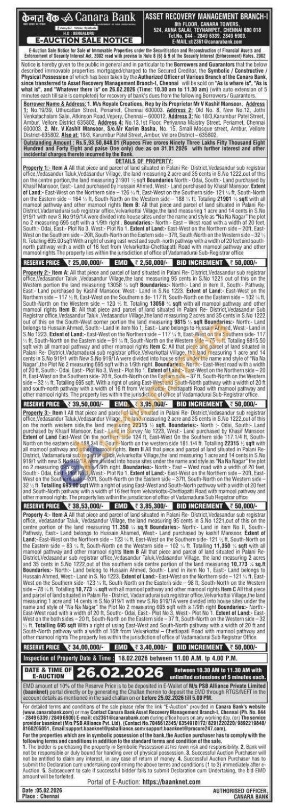 Item A All that piece and parcel of land situated in Palani Re-District, Vedasandur sub registrar office, Vedasandur Taluk, Vedasandur Village, the land measuring 95 cents in S.No 1221, out of this on the centre portion of the land measuring 11,350 sq.ft Boundaries: North: Land in item No II, South-Pathway, East:- Land belongs to Hussain Ahamed, West- Land purchased by kashif Mansoor. Extent of Land:-East-West on the Northern side-123 ft, East-West on the Southern side-121ft, South-North on the Eastern side-83% ft. South-North on the Western side-102 ft. Totalling 11,350 sqft with all mamool pathway and other mamool rights Item B All that piece and parcel of land situated in Palani Re-District, Vedasandur sub registrar office, Vedasandur Taluk, Vedasandur Village, the land measuring 2 acres and 35 cents in S.No 1222 out of this southern side centre portion of the land measuring 10,773 sq.ft Boundaries:- North:- Land belong to Hussain Ahmed, South: Land in item No 1, East:- Land belongs to Hussain Ahmed, West:-Land in S. No 1223. Extent of Land:-East-West on the Northern side-121% ft, East-West on the Southern side-123 ft, South-North on the Eastern side-98 ft, South-North on the Western side-78 ft. Totalling 10,773 sqft with all mamool pathway and other mamool rights Item C All that piece and parcel of land situated in Palani Re-District, Vadamadurai sub registrar office, Velvarkottai Village the land measuring 1 acre and 14 cents in S.No 919/1 with new S.No 919/1A were divided into house sites under the name and style of "Na Na Nagar" the Plot No 2 measuring 695 sqft with a 1/9th right Boundaries:- North:-East-West road with a width of 20 ft, South: Odal, East:- Plot No 3, West:- Plot No 1. Extent of Land:- East-West on the both sides 20 ft. South-North on the Eastern side-37 ft, South-North on the Western side-32 ft. Totalling 695 sqft With a right of using East-West and South-North pathway with a width of 20 ft and South-North pathway with a width of 16ft from Velvarkottai Chettiapati Road with mamool pathway and other mamool rights The property lies within the jurisdiction of office of Vadamadurai Sub Registrar Office