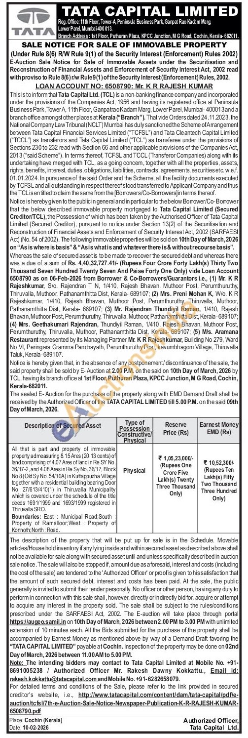 All that is part and property of immovable property admeasuring 8.15 Ares (20.13 cents) of land comprising of 4.07 Ares of land in Re SY No. 36/17-2, and 4.08 Aresin Re Sy No. 36/17, Block No 8 (Old Sy No. 54/10A) in Kuttappuzha Village together with a residential building bearing Door No. 27/613/410(1) in Thiruvalla Municipality which is covered under the schedule of the title deeds 1691/1999 and 1693/1999 registered in Thiruvalla SRO. Boundaries: East: Municipal Road; South: Property of Ramalloor; West: Property of Konnoth; North: Road.
