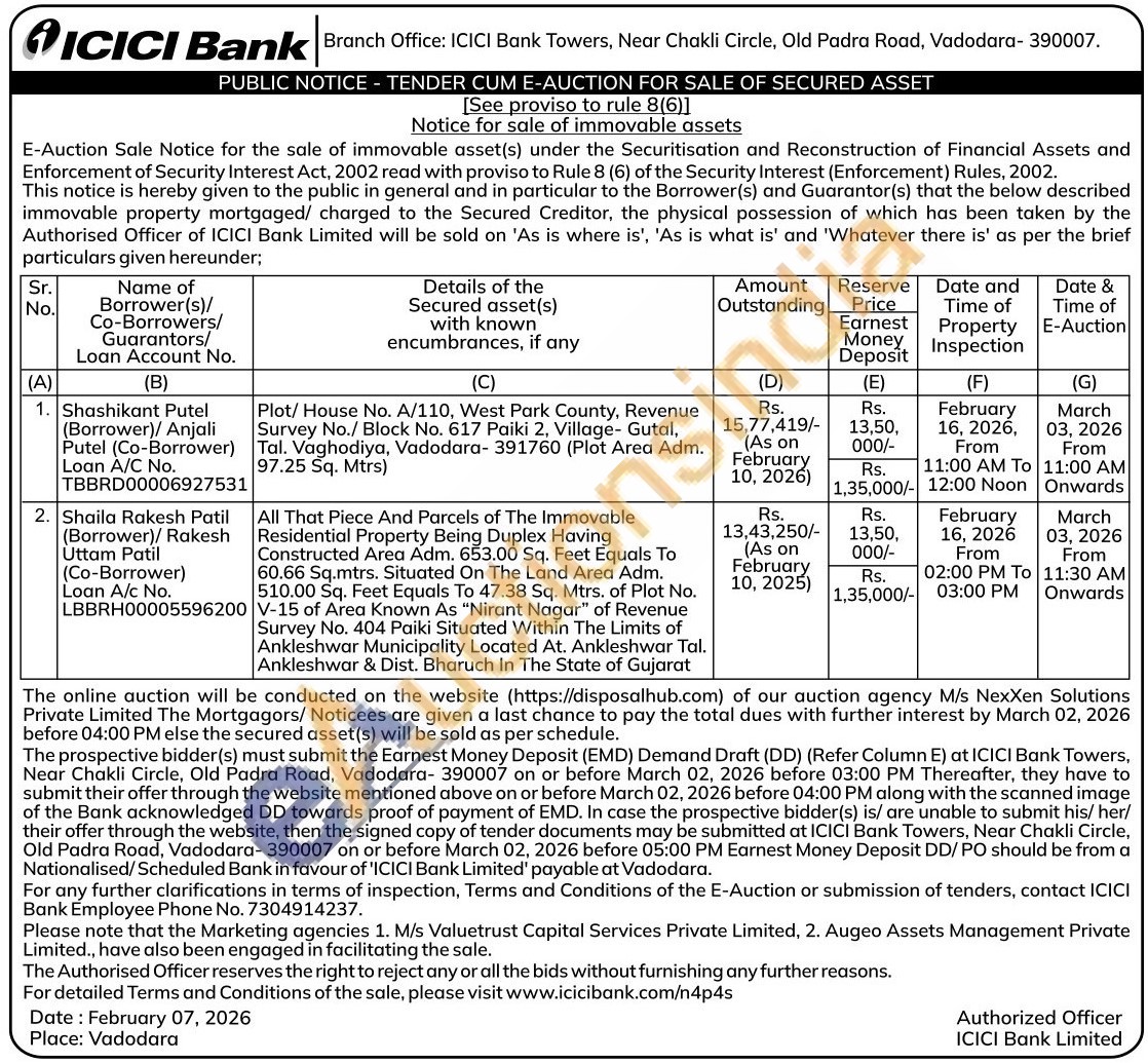 All That Piece And Parcels of The Immovable Residential Property Being Duplex Having Constructed Area Adm. 653.00 Sq. Feet Equals To 60.66 Sq.mtrs. Situated On The Land Area Adm. 510.00 Sq. Feet Equals To 47.38 Sq. Mtrs. of Plot No. V-15 of Area Known As "Nirant Nagar" of Revenue Survey No. 404 Paiki Situated Within The Limits of Ankleshwar Municipality Located At. Ankleshwar Tal. Ankleshwar & Dist. Bharuch In The State of Gujarat