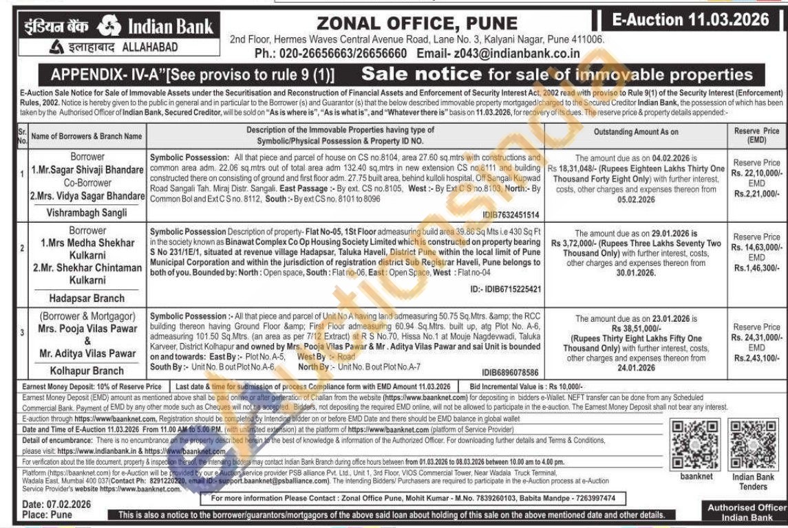 Symbolic Possession: All that piece and parcel of house on CS no.8104, area 27.60 sq.mtrs with constructions and common area adm. 22.06 sq.mtrs out of total area adm 132.40 sq.mtrs in new extension CS no.8111 and building constructed there on consisting of ground and first floor adm. 27.75 built area, behind kulloli hospital, Off Sangali Kupwad Road Sangali Tah. Miraj Distr. Sangali. East Passage: By ext. CS no.8105. West:-By Ext C S no.8103, North:- By Common Boland ExtC Sno. 8112, South :-Byext CS no. 8101 to 8096