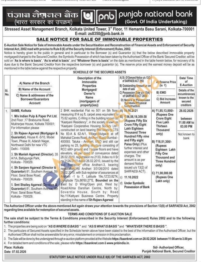 2 BHK residential Flat no 501 on 5th floor, measuring 814 sq ft. carpet area equivalent to 75.62 sqmtrs, C-Wing in the building known as "Kaatyani Residency", in the society known as "Kaatyani Cooperative Housing Society Ltd". constructed on land bearing Plot bearing CTS No 83-A & 62-A/1, Village-Mulgaon at off Mahakal Caves Road, Andheri (East) Mumbai-400093. Taluka Andheri, MSD and stilt car parking no 25, building structure consisting of RCC stilt ground and 7 upper floors and have elevators, as per deed of conveyance dated 26.02.2010, registration no 2133, Index no ll Sr no 2126/2010 dated 26.02.2010, issued by the sub Registrar office Andheri-3, bearing registration no Andheri 3/3126/2010 dated 26.02.2010, with Sub registrar of assurances at Andheri 1 to 7, Latitude 190, 12'23.82 N. c) Longitude 720,86'60.27°E, Bounded on the East by: D Wing/Open plot, West by: d) Road/Atma Darshan Centre, North by: Soverdia House, South by: Road No.11/Kattyani Business Centre. Property standing in the name of Sh Rajeev Agarwal
