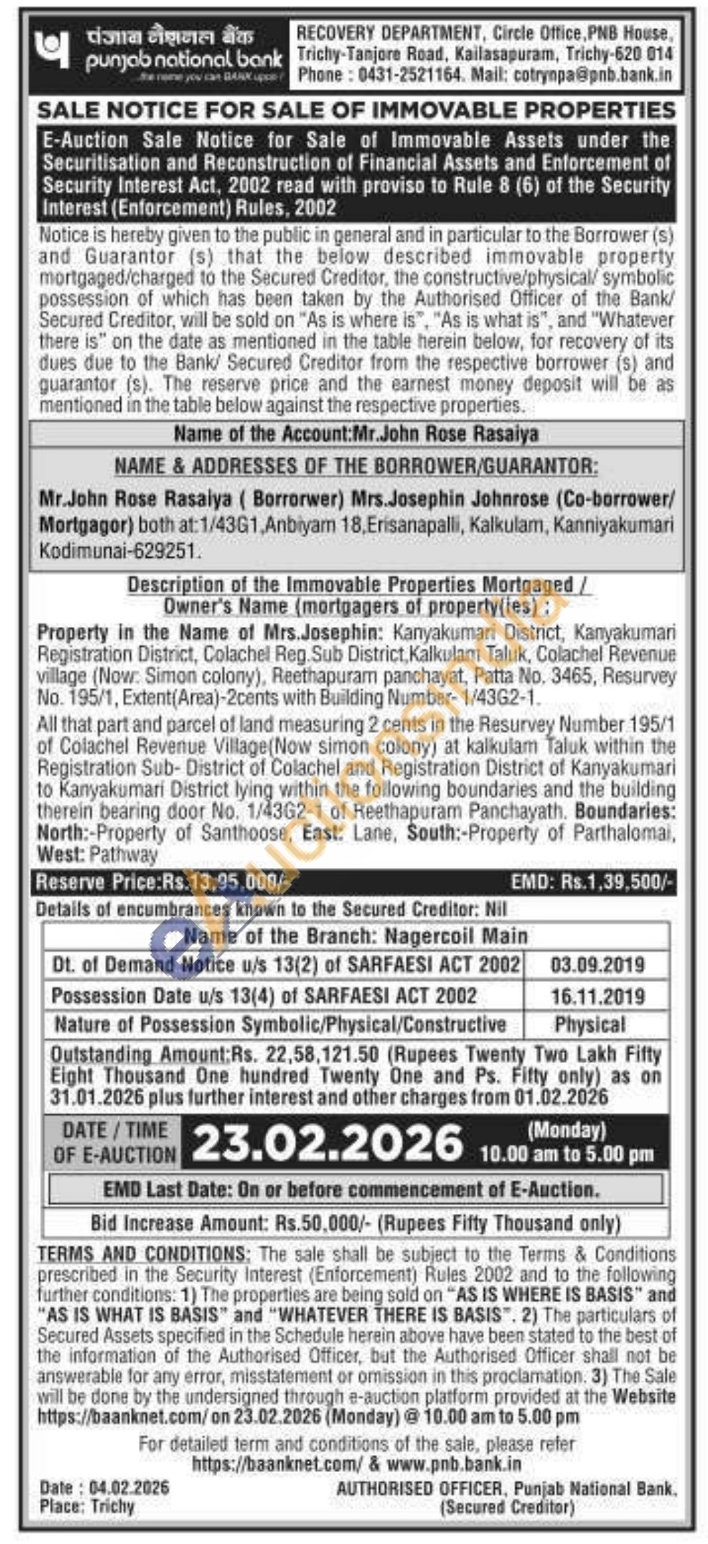 Description of the Immovable Properties Mortgaged/Owner's Name (mortgagers of property(ies): Property in the Name of Mrs.Josephin: Kanyakumari District, Kanyakumari Registration District, Colachel Reg Sub District, Kalkulam Taluk, Colachel Revenue village (Now: Simon colony), Reethapuram panchayat, Patta No. 3465, Resurvey No. 195/1, Extent(Area)-2cents with Building Number-1/4362-1.