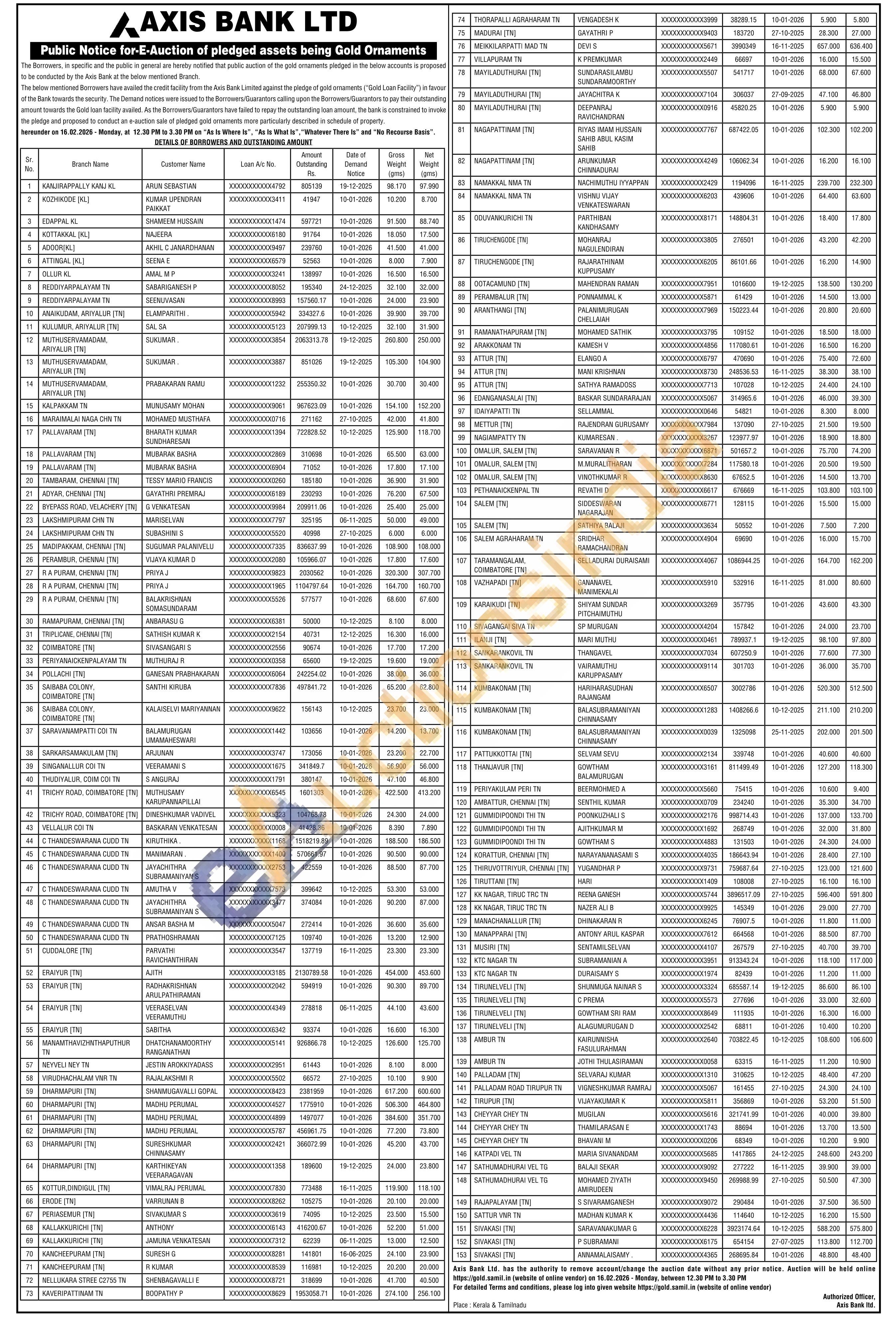 Axis Bank Gold Auctions Auction in Kozhikode
