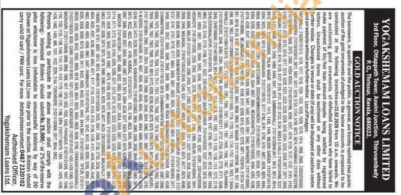 YOGAKSHEMAM LOANS LIMITED Gold Auctions Auction in Thrissur