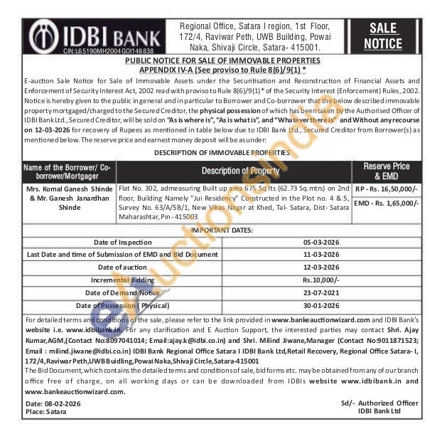 Flat No. 302, admeasuring Built up area 675 Sq.fts (62.73 Sq.mtrs) on 2nd floor, Building Namely "Jui Residency" Constructed in the Plot no. 4 & 5, Survey No. 63/A/5B/1, New Vikas Nagar at Khed, Tal- Satara, Dist- Satara Maharashtar, Pin-415003