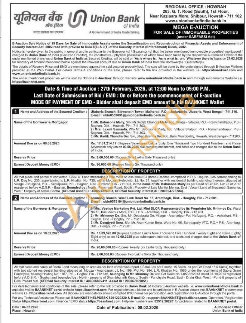 All that piece and parcel of Bastu Land measuring an area as per land conversion report 4 Satak (as per Parcha 15 Satak, as per Gift Deed 15.5 Satak) together with two storied residential building situated at Mouza-Anandapur, J.L No. 199, Plot No. 384, L.R. Khatian No. 1985 under the local limits of Saora Gram Panchyate, bearing Holding No. 1167, P.S. Goghat, Pin-712 616, belonging to Mr. Mrinmoy De vide Gift Deed No. 1-05332/2013 dated 07.10.2013 registered. before A.D.S.R-Goghat and bounded by: North-property of Shambhunath Kundu, South-Panchyate Road, East - Drain Khal, West-Pond & property of Debi Prasad Mal (CERSAI Security Interest ID: 400066892411, Asset ID: 200067899051)