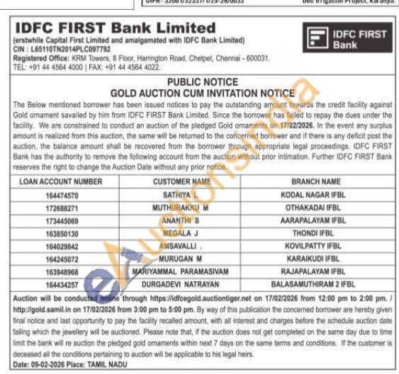 IDFC First Bank Ltd Gold Auctions Auction in Chennai