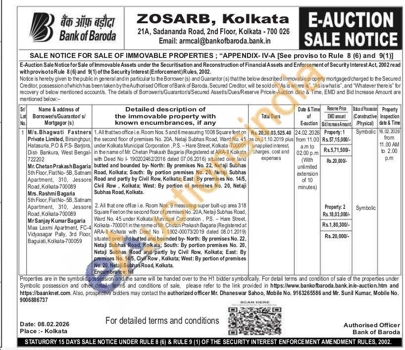 All that two office i.e. Room Nos. 5 and 6 measuring 1008 Square feet on the second floor of premises No. 20A, Netaji Subhas Road, Ward No. 45 under Kolkata Municipal Corporation, P.S.-Hare Street, Kolkata-700001 in the name of Mr. Chetan Prakash Bagaria (Registered at ARA-II Kolkata with Deed No - 190202462/2016 dated 07.06.2016) situated over land butted and bounded by- North: By premises No. 22, Netaji Subhas Road, Kolkata; South: By portion premises No. 20, Netaji Subhas Road and partly by Civil Row, Kolkata; East: By premises No. 14/5, Civil Row, Kolkata: West: By portion of premises No. 20, Netaji Subhas Road, Kolkata