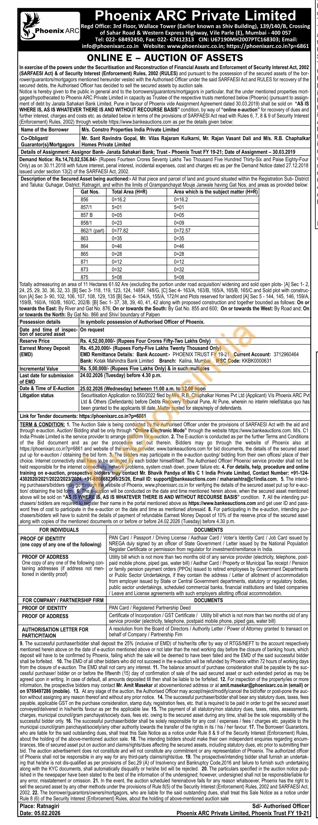 Description of the Secured Asset being auctioned:- All that piece and parcel of land and ground situated within the Registration Sub-District and Taluka: Guhagar, District: Ratnagiri, and within the limits of Grampanchayat Mouje Janwale having Gat Nos. and areas as provided below: Totally admeasuring an area of 11 Hectares 61.92 Are (excluding the portion under road acquisition/ widening and sold open plots- [A] Sec 1-2, 24, 25, 29, 30, 36, 32, 33. [B] Sec 3-118, 119, 123, 124, 148/F, 148/G, [C] Sec 4-163/A, 163/B, 165/A, 165/B, 165/C and Sold plot with construc-tion [A] Sec 3-90, 102, 106, 107, 108, 129, 135 [B] Sec 4-154/А, 155/A, 172/H and Plots reserved for landlord [A] Sec 5-144, 145, 146, 159/A, 159/B, 160/A, 160/B, 160/C, 202/B. [B] Sec 1-37, 38, 39, 40, 41, 42 along with proposed construction and together bounded as follows: On or towards the East: By River and Gat No. 876; On or towards the South: By Gat No. 855 and 600; On or towards the West: By Road and; On or towards the North: By Gat No. 866 and Shiv/ boundary of Palpen