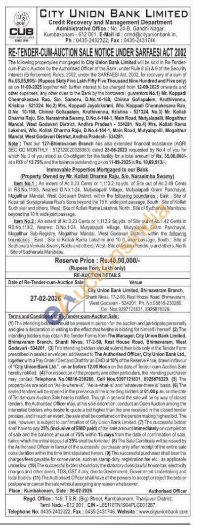 Item No.1: An extent of Ac.0.23 Cents or 1,113.2 sq yds. of Site out of Ac 2.49 Cents in RS No.110/3, Nearest D.No.1-24, Mutyalapali Village, Mutyatapall Gram Panchayat, Mogalthur Mandal, West Godavari District, within the following boundaries East: Site of Kopanali Suryaprakasa Rao's Sons beyond the 18 ft. wide joint passage, South: Site of Kollat Sudhakar and others, West Site of Koliati Rama Lakshmi, North Site of Sadhanala Manibabu beyond the 10 ft. wide joint passage Item No.2: An extent of Ac.0.23 Cents or 1,113.2 Soyds of Site out of Ac. 1.42 Cents in RS.No. 1102. Nearest D.No.1-24, Mutyalapalli Vilage. Mutyalapalli Gram Panchayat Mogalthur Sub-Registry, Mogathur Mandal, West Godavari District, within the following boundanes East: Site of Koliati Rama Lakshmi and 10 ft. wide passage. South Site of Sadhanala Venkata Swamy Naidu and others, West Site of Addala Peddiraju and others, North Site of Sadhanala Maribabu