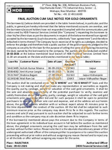 HDB Financial Services Limited Gold Auctions Auction in Jaipur