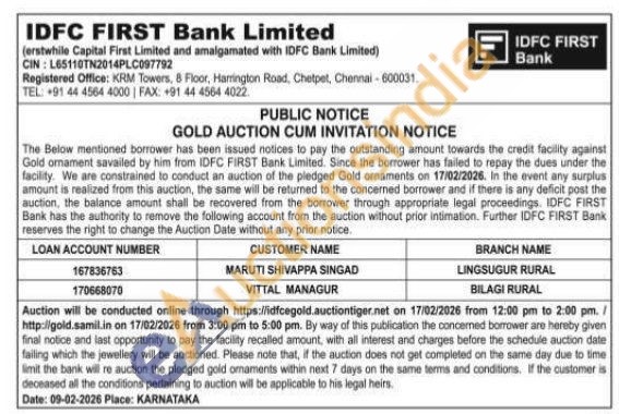 IDFC First Bank Ltd Gold Auctions Auction in Bengaluru
