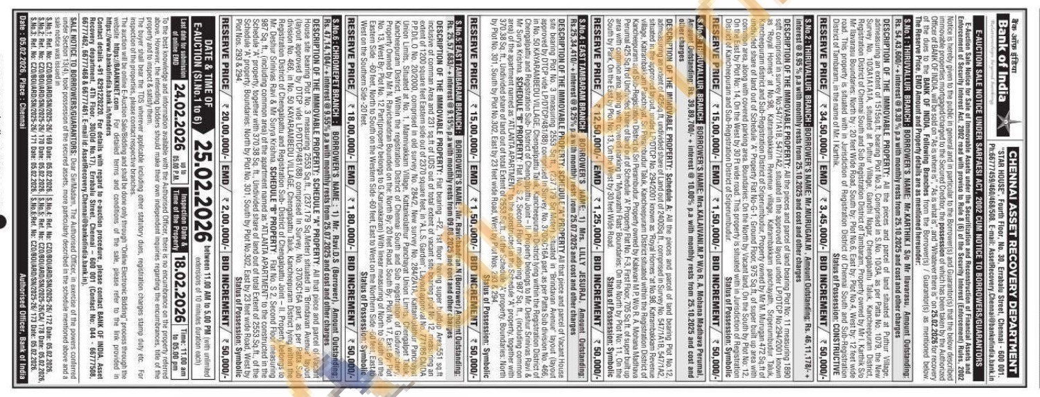 DESCRIPTION OF THE IMMOVABLE PROPERTY: Flat bearing -F2, 1st floor having super buildup Area:551 sq.ft inclusive of comman Area and 231 sq.ft of UDS out of total extent of vacant site bearing plot No 12, measuring an extent of 1200 square feet Eastern side out of 2370 square feet, in "A.L.S. Garden", Layout approval No. 771/86 CMDA P.P.D/LO No. 20/2000, comprised in old survey No. 284/2, New survey No. 284/2A1A, Kattankolathur Panchayat Union Limits, Situated at No. 1, Mannivakkam Village, Kattankolathur Panchayat Union Limits, Chengalpet Taluk, Kancheepuram District, Within the registration District of Chennai South and Sub registration of Guduvanchery. Property Owned by Mr N. Ravichandran Bounded on the North By: 20 feet Road, South By. Plot No. 17, East By: Plot No. 13, West By: Plot No. 12 Part(property belongs to G. Karunakaran) With linear measuring of North to South on the Eastern Side -60 feet, North to South on the Western Side -60 feet, East to West on the Northern Side-60 feet, East to West on the Southern Side-20 feet.
