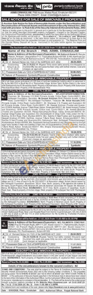 Contact no : 0484-2350477, Email: CS4459@pnb.bank.in SALE NOTICE FOR SALE OF IMMOVABLE