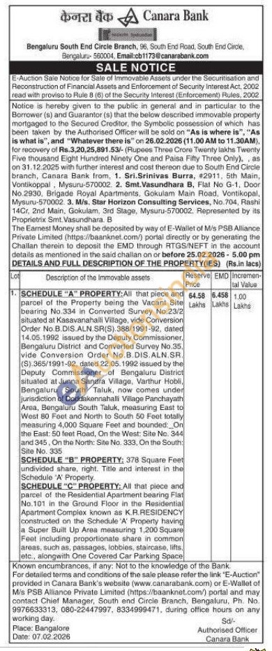SCHEDULE "A" PROPERTY: All that piece and parcel of the Property being the Vacant Site bearing No.334 in Converted Survey No.23/2 situated at Kasavanahalli Village, vide Conversion Order No.B.DIS.ALN.SR(S).388/1991-92, dated 14.05.1992 issued by the Deputy Commissioner, Bengaluru District and Converted Survey No.35, vide Conversion Order No.B.DIS.ALN.SR. (S).365/1991-92, dated 22.05.1992 issued by the Deputy Commissioner of Bengaluru District situated at Junna Sandra Village, Varthur Hobli, Bengaluru South Taluk, now comes under jurisdiction of Doddakennahalli Village Panchayath Area, Bengaluru South Taluk, measuring East to West 80 Feet and North to South 50 Feet totally measuring 4,000 Square Feet and bounded: On the East: 50 feet Road, On the West: Site No. 344 and 345, On the North: Site No. 333, On the South: Site No. 335 SCHEDULE "B" PROPERTY: 378 Square Feet undivided share, right. Title and interest in the Schedule 'A' Property. SCHEDULE "C" PROPERTY: All that piece and parcel of the Residential Apartment bearing Flat No.101 in the Ground Floor in the Residential Apartment Complex known as K.R.RESIDENCY constructed on the Schedule 'A' Property having a Super Built Up Area measuring 1,200 Square Feet including proportionate share in common areas, such as, passages, lobbies, staircase, lifts, etc., alongwith One Covered Car Parking Space