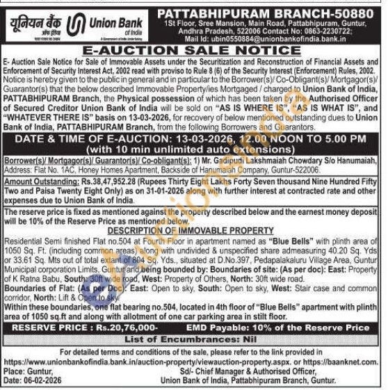 Residential Fiat no 4 at Second floor in residential apartment named as "Padma Residency" with plinth area of 1281 Sq. ft., (including common area) & car parking area of 80 Sq. Ft. along with undivided share admeasuring 39.00 sq. yds. or 32.60 sq. mts. out of total extent of 600.00 sq. yds., situated in Survey no. 72/2, Sub Division survey no. 72/2A1, Municipal Ward no. 27A, Door No. 40-12-7A, Seetharama Nagar, Patamata Lanka Area, Vijayawada Municipal corporation, Krishna District, Vijayawada and being bounded by: (as per doc): Boundaries of Site: (As per Doc): East: Property of Veerapaneni Chakradhara Rao, South: Joint way, West: Property of Katari Prasunamba, North: Property of Mohammad Abdul Ravuf. Boundaries of Flat: (As per Doc): East: Common Corridor, South: Open to Sky, West: Open to Sky, North: Common Corridor, Open to Sky.