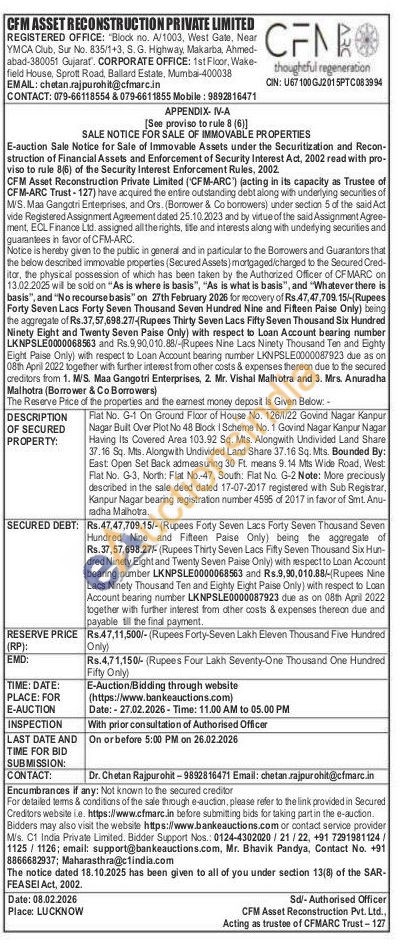 Flat No. G-1 On Ground Floor of House No. 126/1/22 Govind Nagar Kanpur Nagar Built Over Plot No 48 Block I Scheme No. 1 Govind Nagar Kanpur Nagar Having Its Covered Area 103.92 Sq. Mts. Alongwith Undivided Land Share 37.16 Sq. Mts. Alongwith Undivided Land Share 37.16 Sq. Mts. Bounded By: East: Open Set Back admeasuring 30 Ft. means 9.14 Mts Wide Road, West: Flat No. G-3, North: Flat No.-47, South: Flat No. G-2 Note: More preciously described in the sale deed dated 17-07-2017 registered with Sub Registrar, Kanpur Nagar bearing registration number 4595 of 2017 in favor of Smt. Anu-radha Malhotra.