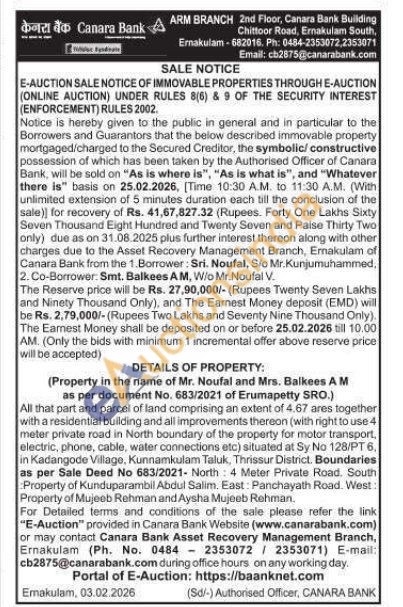 All that part and parcel of land comprising an extent of 4.67 ares together with a residential building and all improvements thereon (with right to use 4 meter private road in North boundary of the property for motor transport, electric, phone, cable, water connections etc) situated at Sy No 128/PT6, in Kadangode Village, Kunnamkulam Taluk, Thrissur District. Boundaries as per Sale Deed No 683/2021-North: 4 Meter Private Road. South Property of Kunduparambil Abdul Salim. East Panchayath Road. West: Property of Mujeeb Rehman and Aysha Mujeeb Rehman