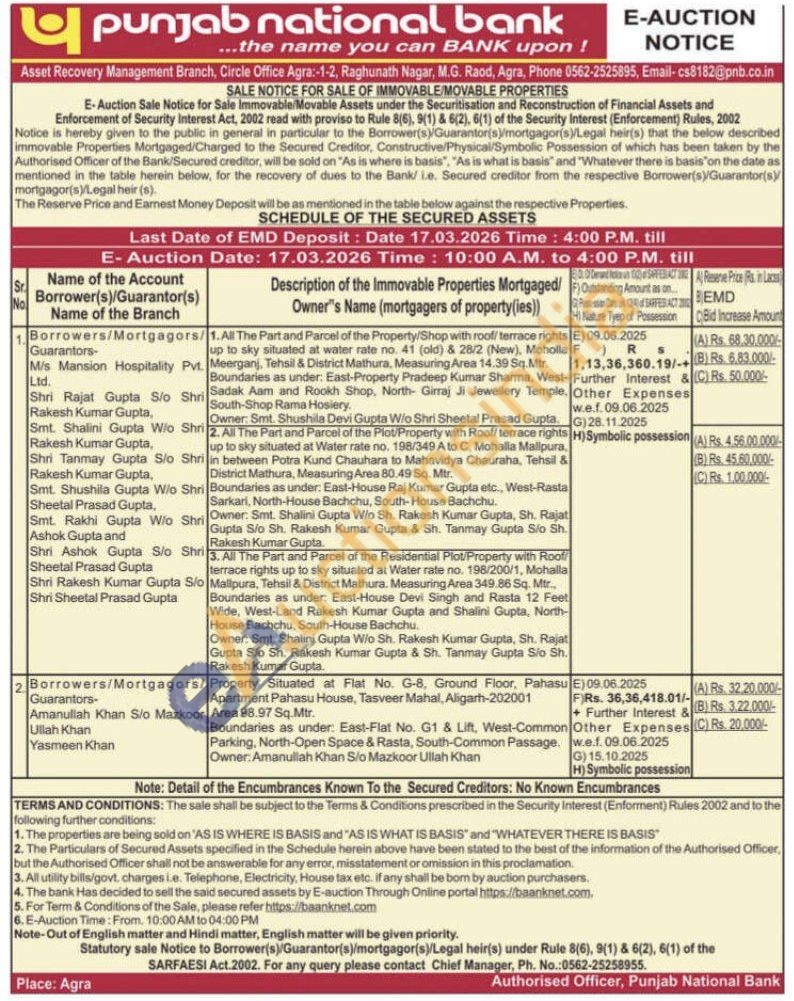 3. All The Part and Parcel of the Residential Plot/Property with Roof terrace rights up to sky situated at Water rate no. 198/200/1, Mohalla Mallpura, Tehsil & District Mathura. Measuring Area 349.86 Sq. Mtr Boundaries as under: East-House Devi Singh and Rasta 12 Feet Wide, West-Land Rakesh Kumar Gupta and Shalini Gupta, North-House Bachchu, South-House Bachchu. Owner: Smt. Shalini Gupta Wio Sh. Rakesh Kumar Gupta, Sh. Rajat Gupta Sio Sh. Rakesh Kumar Gupta & Sh. Tanmay Gupta Sio Sh. Rakesh Kumar Gupta.