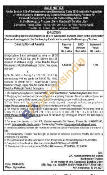 A)Agriculture Land admeasuring area of 28.25 Gurtas of 3418:25 50 yds in Survey No 128 Situated at Malkapur village, Uppal Mandal, Kapra Municipality, Medchal Malkagin District, Telangana, 500-039 B)Plot No. 55/6, in Survey No. 128, 129, 131 132 admeasuring 400 sq yards for 336.90 Sq Mis situated at Block No.01, Bramhapuri Colony Mallapur Village, Uppal Mandal, Kapra Munkspally Medchul Malkajgin Distict, Telangana
