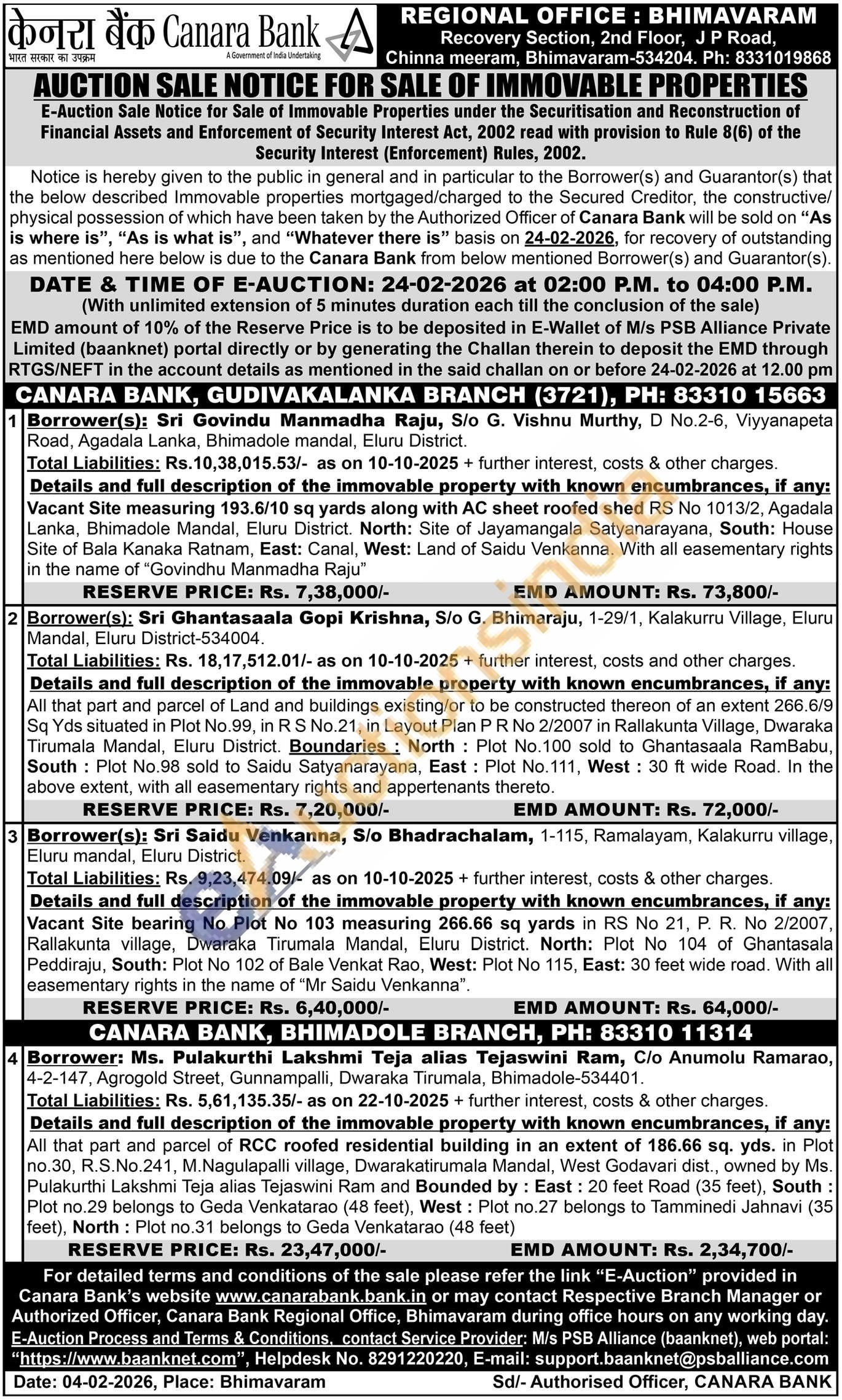 Details and full description of the immovable property with known encumbrances, if any: All that part and parcel of Land and buildings existing/or to be constructed thereon of an extent 266.6/9 Sq Yds situated in Plot No.99, in R S No.21, in Layout Plan PR No 2/2007 in Rallakunta Village, Dwaraka Tirumala Mandal, Eluru District. Boundaries: North: Plot No.100 sold to Ghantasaala RamBabu, South: Plot No.98 sold to Saidu Satyanarayana, East: Plot No. 111, West: 30 ft wide Road. In the above extent, with all easementary rights and appertenants thereto.