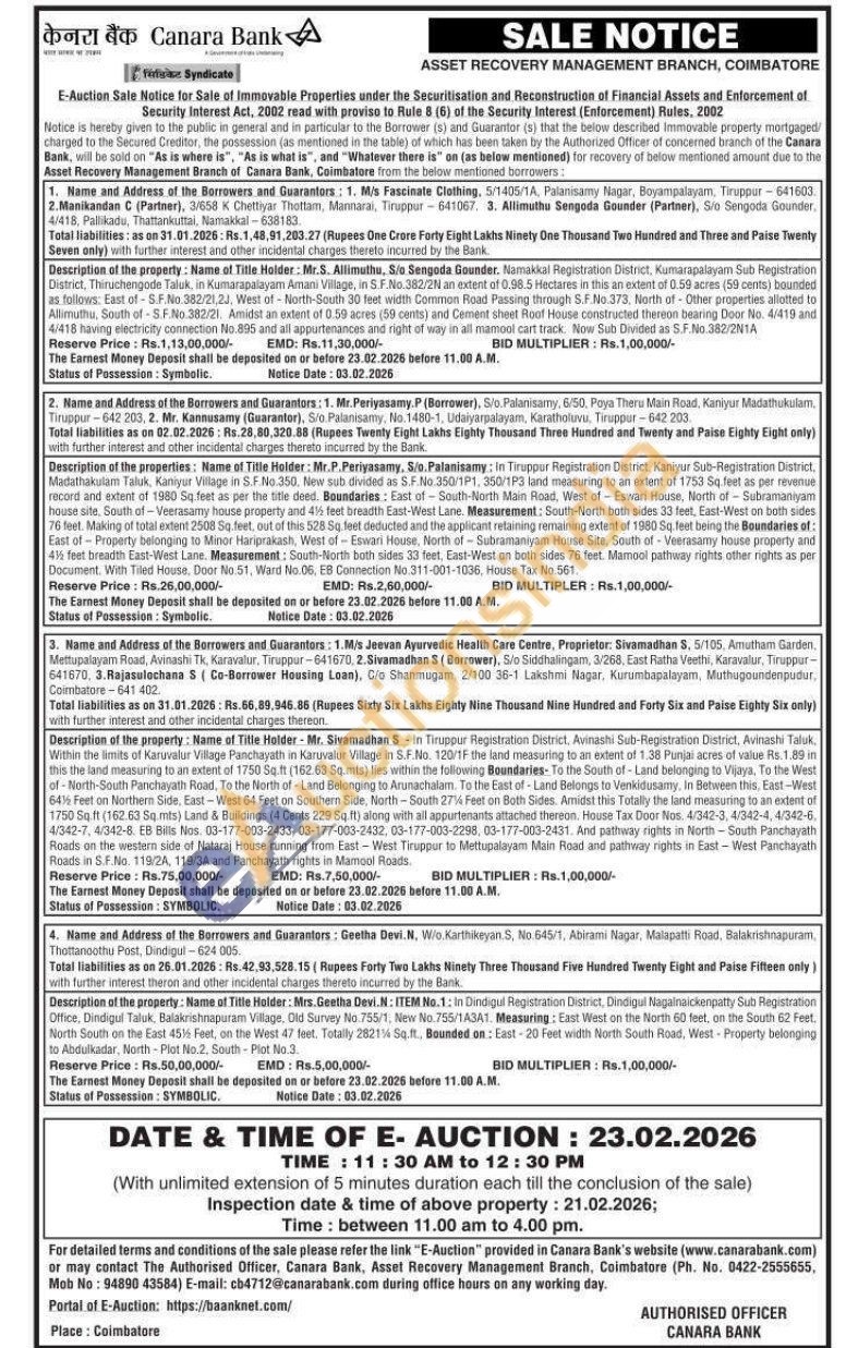 4) ITEM No.1: In Dindigul Registration District, Dindigul Nagalnaickenpatty Sub Registration Office, Dindigul Taluk, Balakrishnapuram Village. Old Survey No. 755/1, New No.755/1A3A1. Measuring: East West on the North 60 feet, on the South 62 Feet. North South on the East 4516 Feet, on the West 47 feet. Totally 28214 Sq.ft., Bounded on: East-20 Feet width North South Road, West-Property belonging to Abdulkadar, North-Plot No.2, South Plot No.3.