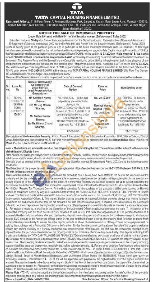 Description of the Immovable Property: All that Piece & Parcels at Plot No. 9 Situated at Khasra No. 2893, Village Tuleda, District Alwar, Rajasthan area admeasunng 109.37 Sq Yards with common amenities as mentioned in sale deed Bounded As-East: Plot No. 10 West: Plot No, 8 North: Other's Land South: Road