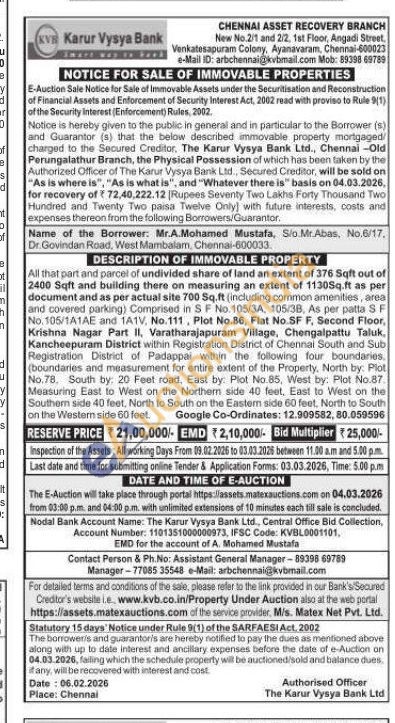 All that part and parcel of undivided share of land an extent of 376 Sqft out of 2400 Sqft and building there on measuring an extent of 1130Sq.ft as per document and as per actual site 700 Sq.ft (including common amenities, area and covered parking) Comprised in SF No.105/3A, 105/38, As per patta SF No. 105/1A1AE and 1A1V, No.111, Plot No.86, Flat No.SF F, Second Floor, Krishna Nagar Part II, Varatharajapuram Village, Chengalpattu Taluk, Kancheepuram District within Registration District of Chennal South and Sub Registration District of Padappal within the following four boundaries. (boundaries and measurement for entire extent of the Property, North by: Plot No.78. South by: 20 Feet road, East by: Plot No.85, West by: Plot No.87. Measuring East to West on the Northern side 40 feet, East to West on the Southern side 40 feet, North to South on the Eastern side 60 feet, North to South on the Western side 60 feet