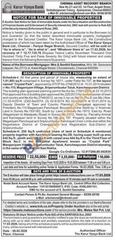 Schedule- All that piece and parcel of house site, measuring an extent of 1,01,893 sq.ft comprised in Survey No. 197/1, under Patta No.707, in the layout named "Crystal Park", approved by DTCP No.2748/2012 σ. 10.01.2014 situated in No. 115, Maganiyam Village, Sriperumbudur Taluk, Kancheepuram District The building plan approved planning permit Na.Ka. No. 17561/2012 dt.23.10.2013 Plot approved A to G building plan approved No. 225/2013 for commissioner of town and country and Na.Ka. No.2748/2012, se ma.3, ka va. Na.vu. Thu.E.(se.Ma.) Nos. (1) 02-A/2014, (2)02-Aa/2014, (3) 02-E/2014 92) 02-Vu/2014 dt.10.01.2014 by Deputy Director of Town and Country Planning. Chengalpet approved by President, No. 115 Maganiyam Panchayat. Bounded on the North by: V. Krishnan Land in Survey No.193/182, South by: Land in Survey No. 197/2, East by: Road (Maganiyam to Malaipattu Road) in Survey No. 197/2, West by: Parvathy Ammal and Kanniappan land in Survey No. 196 and 197. Property situated within the Maganiyam Panchayat and Sriperumbudur Panchayat Union Limits and within the Registration District of Chengalpattu and Registration Sub-District of Sriperumbudur, Schedule-11: 259 Sq.ft undivided share of land in Schedule A mentioned property together with Apartment bearing No.DB, having super built up area 642 Sq.ft., plinth area 535 Sq.ft with carpet area 444 Sq.ft in the Third Floor of Block No.C in the Residetial Apartment known as "Crystal Park" Manganiyam Village, Sriperumbudur Taluk, Kancheepuram District standing in the name of Mrs. Senthil Sasi Rekha.
