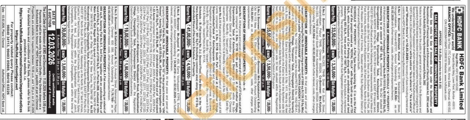 Item No.1. All that piece and parcel of Vacant land of an extent of 27 Cents out of 48 Cents comprised in S.No. 91/18 North part situated at Kundrathur Village, Sriperumbudur Taluk of Kancheepuram District and Situate within the Sub-Registration District of Kundrathur and Registration District of South Chennai. Boundanes North By-Vacant Land/House, South By-30 Feet Road, East By-vacant Land/Houses in S.No.91/1C & West By-Vacant Plots in S.No. 91/1A Item No.2.All that piece and parcel of Vacant land of an extent of 15 Cents out of 48 Cents comprised in S.No. 91/18 South Part situated at Kundrathur Village. SriperumbudurTaluk of Kancheepuram District and situate within the Sub Registration of Kundrathur and Registration District of South Chennai. Boundries North By-30 Feet Road, South By-Vacant Plot/Houses, East By-House in S. No. 91/C & West By-Vacant Plots in S.No. 91/1A Schedule-B: Flat bearing No. 2-J, Second Floor, in the Block-B, in the "Hari Hara Apartments", 901 Sq.Ft (Including common area) along with 412 Sq. Ft, Undivided Share of the land in Schedule-A Property.
