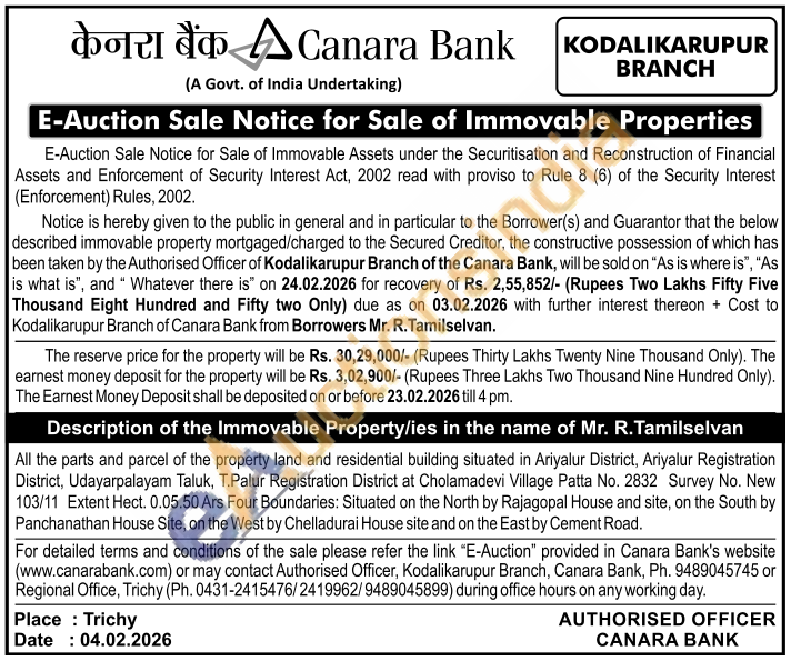 All the parts and parcel of the property land and residential building situated in Ariyalur District, Ariyalur Registration District, Udayarpalayam Taluk, T.Palur Registration District at Cholamadevi Village Patta No. 2832 Survey No. New 103/11 Extent Hect. 0.05.50 Ars Four Boundaries: Situated on the North by Rajagopal House and site, on the South by Panchanathan House Site, on the West by Chelladurai House site and on the East by Cement Road.