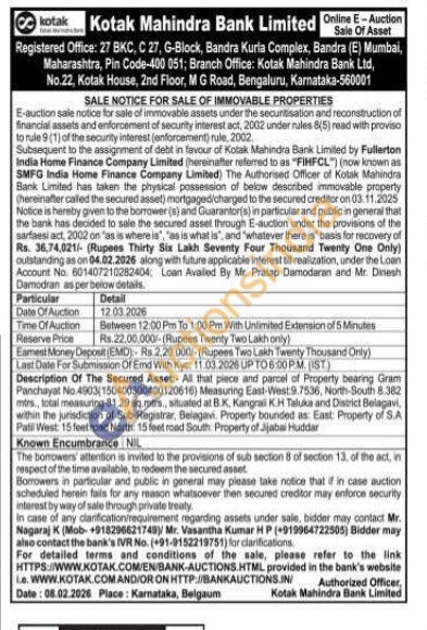 Description Of The Secured Asset: All that piece and parcel of Property bearing Gram Panchayat No. 4903(150400300400120616) Measuring East-West:9.7536, North-South 8.382 mtrs, total measuring 81.29 sq.mtrs, situated at B.K. Kangrai KH Taluka and District Belagavi, within the jurisdiction of Sub-Registrar, Belagavi. Property bounded as: East: Property of SA Patil West: 15 feetroad North: 15 feet road South Property of Jijabai Huddar