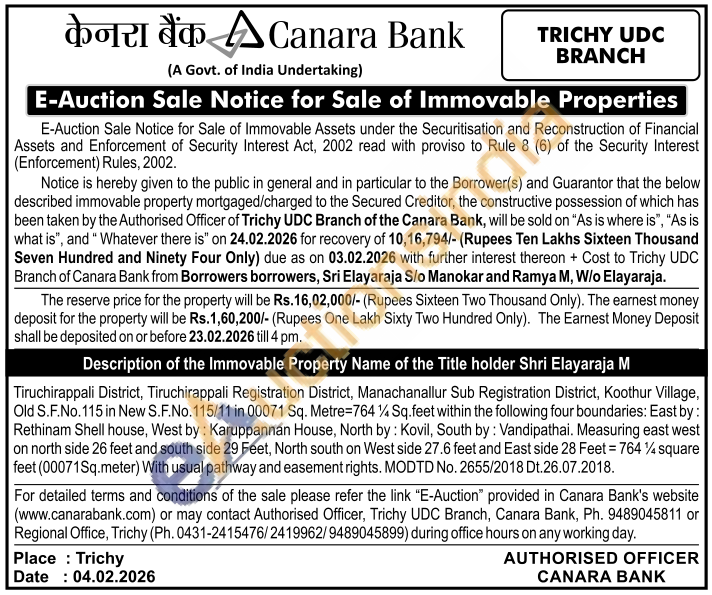 Tiruchirappali District, Tiruchirappali Registration District, Manachanallur Sub Registration District, Koothur Village, Old S.F.No. 115 in New S.F.No. 115/11 in 00071 Sq. Metre=764 1½ Sq.feet within the following four boundaries: East by: Rethinam Shell house, West by: Karuppannan House, North by: Kovil, South by: Vandipathai. Measuring east west on north side 26 feet and south side 29 Feet, North south on West side 27.6 feet and East side 28 Feet = 764 ½ square feet (00071Sq.meter) With usual pathway and easement rights. MODTD No. 2655/2018 Dt.26.07.2018.