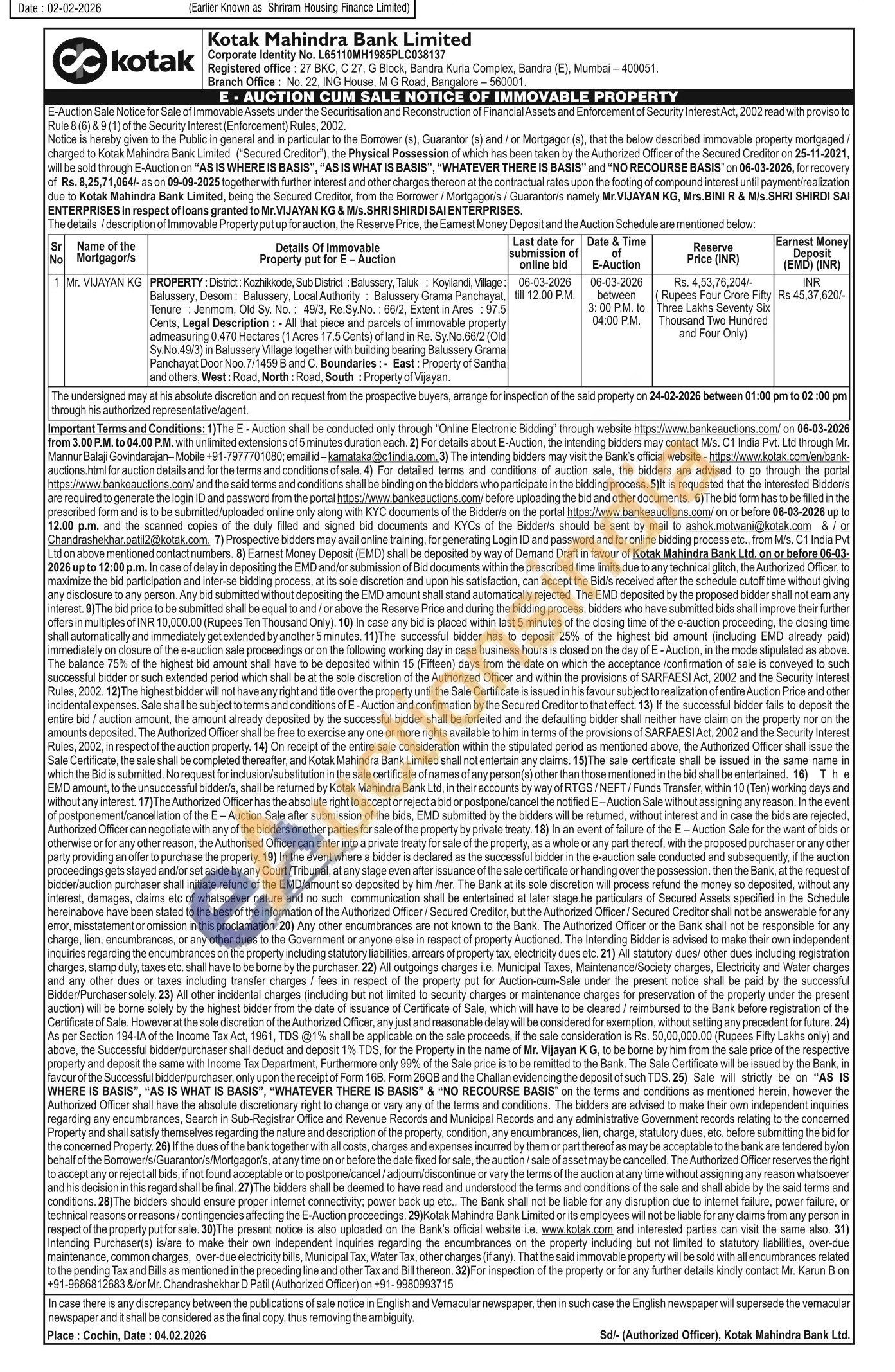 PROPERTY: District: Kozhikkode, Sub District: Balussery, Taluk: Koyilandi, Village: Balussery, Desom: Balussery, Local Authority: Balussery Grama Panchayat, Tenure: Jenmom, Old Sy. No.: 49/3, Re.Sy.No.: 66/2, Extent in Ares: 97.5 Cents, Legal Description: All that piece and parcels of immovable property admeasuring 0.470 Hectares (1 Acres 17.5 Cents) of land in Re. Sy.No.66/2 (Old Sy.No.49/3) in Balussery Village together with building bearing Balussery Grama Panchayat Door Noo. 7/1459 B and C. Boundaries: East: Property of Santha and others, West: Road, North: Road, South: Property of Vijayan