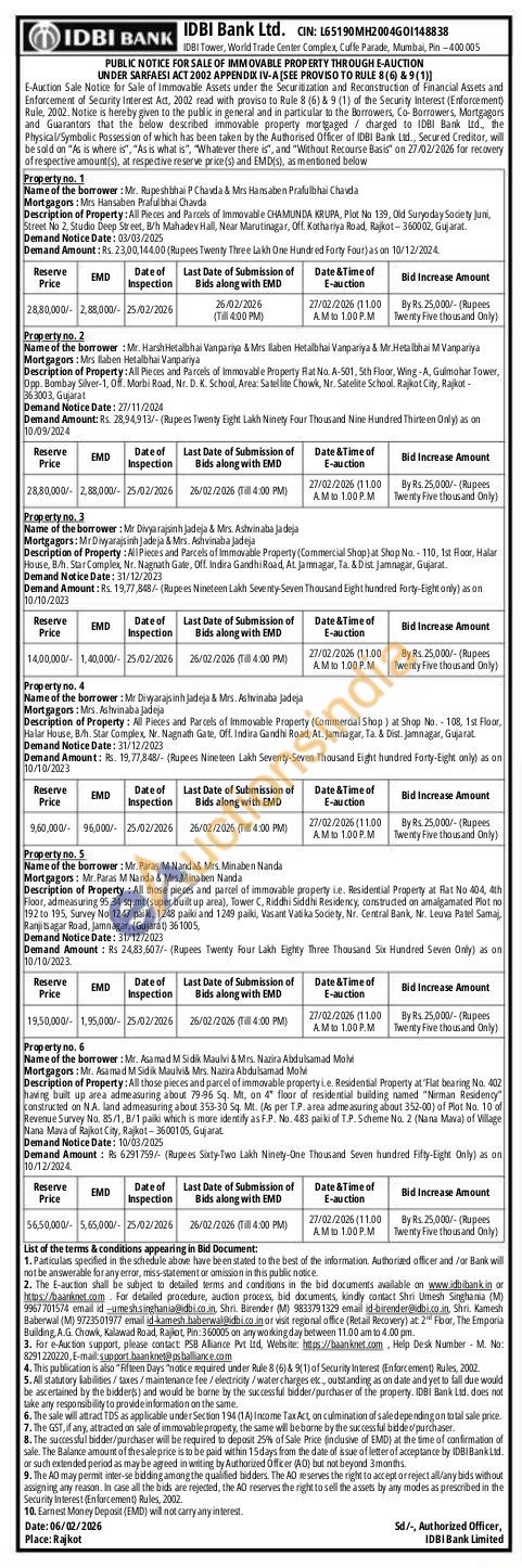 Description of Property: All Pieces and Parcels of Immovable Property Rat No. A-501, 5th Floor, Wing-A, Gulmohar Tower, Opp. Bombay Silver-1, Off. Morbi Road, Nr. D. K. School, Area: Satellite Chowk, Nr. Satelite School. Rajkot City, Rajkot -363003, Gujarat