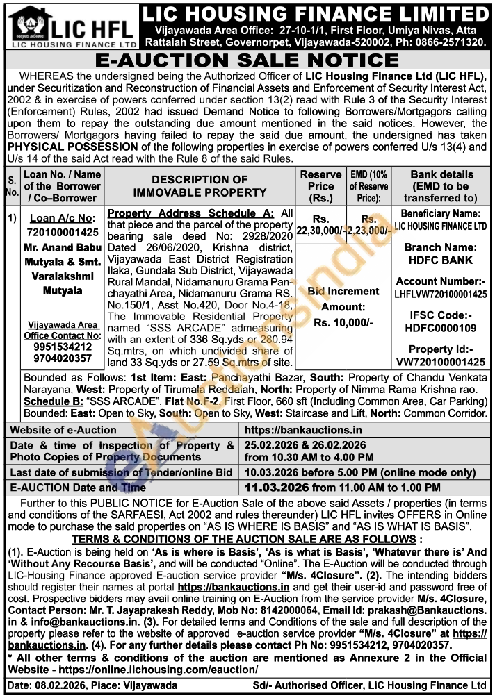 All that piece and the parcel of the property bearing sale deed No: 2928/2020 Dated 26/06/2020, Krishna district, Vijayawada East District Registration Ilaka, Gundala Sub District, Vijayawada Rural Mandal, Nidamanuru Grama Pan-chayathi Area, Nidamanuru Grama RS. No.150/1, Asst No.420, Door No.4-18, The Immovable Residential Property named "SSS ARCADE" admeasuring with an extent of 336 Sq.yds or 280.94 Sq.mtrs, on which undivided share of land 33 Sq.yds or 27.59 Sq.mtrs of site.Bounded as Follows: 1st Item: East: Panchayathi Bazar, South: Property of Chandu Venkata Narayana, West: Property of Tirumala Reddaiah, North: Property of Nimma Rama Krishna rao. Schedule B: "SSS ARCADE", Flat No.F-2, First Floor, 660 sft (Including Common Area, Car Parking) Bounded: East: Open to Sky, South: Open to Sky, West: Staircase and Lift, North: Common Corridor.