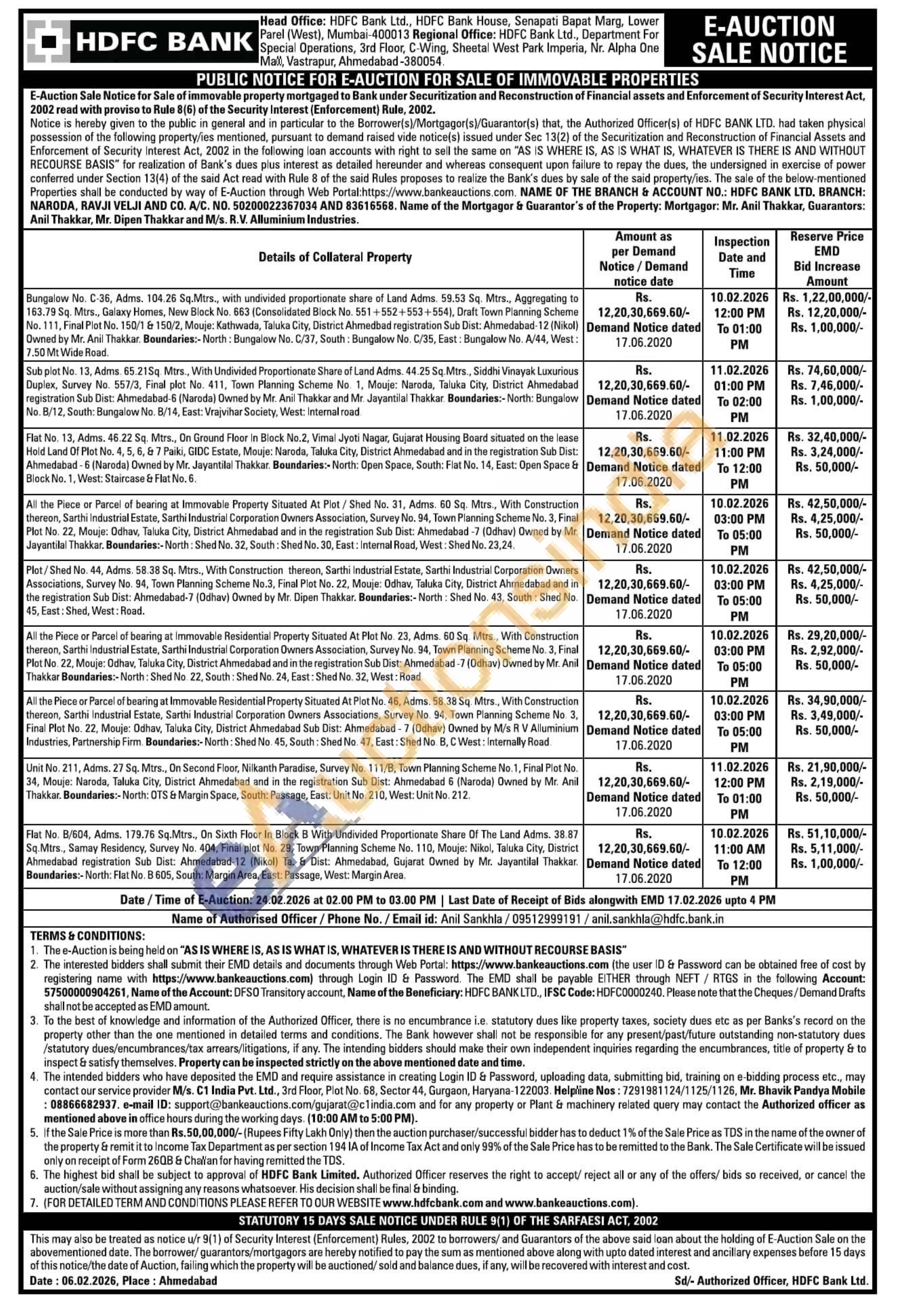 Contact Authorised Officer/ Phone No./Email id: Anil Sankhla /09512999191/anil.sankhla@hdfc.bank.in