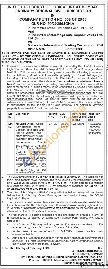 Movable Asset: Godrej Safe Deposit Locker Cabinet (Total Nos.804) 395 Kg Cabinet-and other movables) as per inventory of the Valuer. Immovable Asset: Shop No.1, 2, 3, 4 and 5. Gr. Floor, Building No.31-B, Brindaban Darshan Co-Operative Housing Society Limited, Brindaban Complex Village- Majivade, Thane 400 601 built up Area in Sq.Pt.1410) as per inventory of the Valuer.